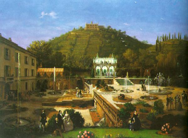 All'interno del giardino di una villa persone in atteggiamenti vari, tra queste si riconoscono Luigi Basiletti, Angelo Inganni con la moglie e Paolo Richiedei che, all'estrema sinistra, accoglie una dama giunta in carrozza; a sinistra la facciata della villa, sullo sfondo sopra un colle coperto di vigne una villa in stile neogotico.