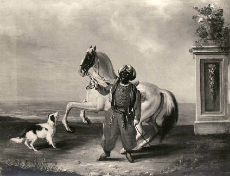 Sulla riva del mare un uomo di colore in abiti arabi tiene per la cavezza un cavallo bianco con le zampe anteriori sollevate, davanti a questo un cane; sullo sfondo a destra un pilastrino decorato con una testa di leone sorregge un vaso di fiori.