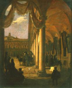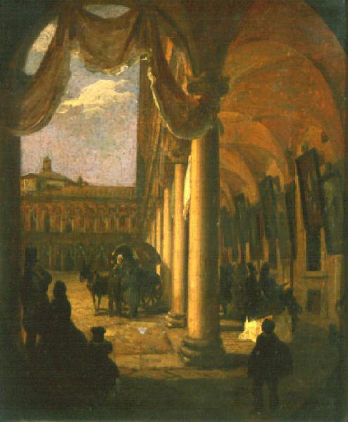 Sotto le volte del porticato del cortile del Filarete dell'Ospedale Maggiore di Milano si trovano alcune persone che osservano dei dipinti appesi alle pareti; ferma a lato del cortile una carrozza.