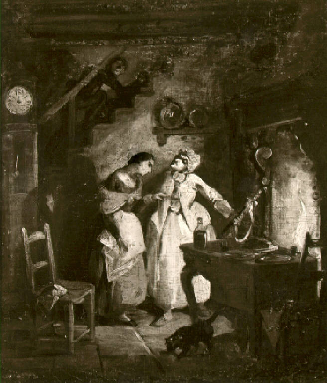 In cucina, davanti ad un focolare, una donna con cuffia tiene nella mano sinistra una spada nel fodero e la mostra ad una seconda donna che trattiene per il braccio, ai loro piedi un gatto; alle loro spalle un uomo, avvolto nell'ombra, sta salendo le scale.