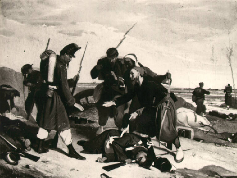 In primo piano, soldato morto steso a terra di tre quarti; attorno a lui, altri soldati in piedi. Sullo sfondo, campo di battaglia.