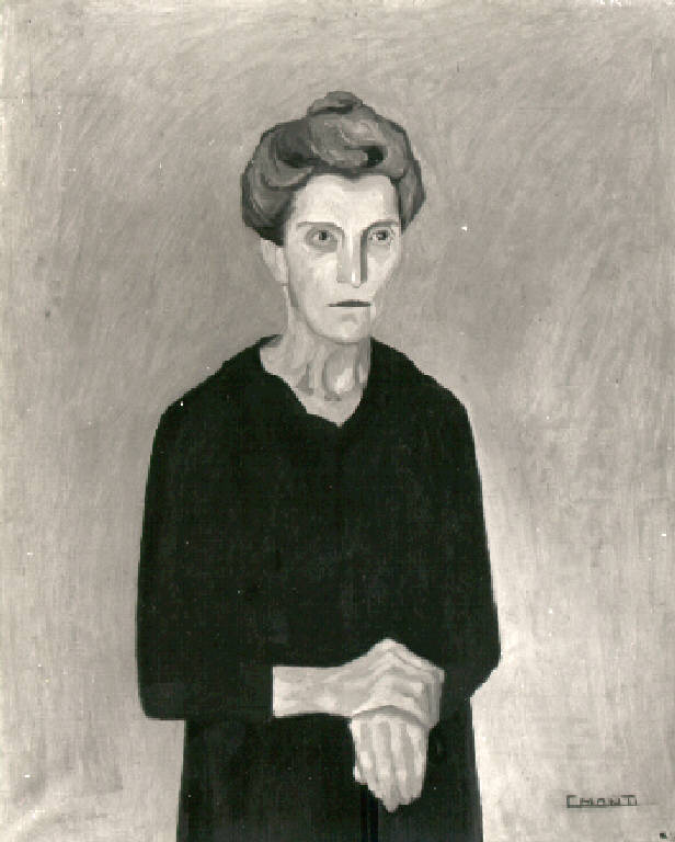 La figura è stante e a mezza figura, i capelli raccolti, le mani appoggiate su un bastone.