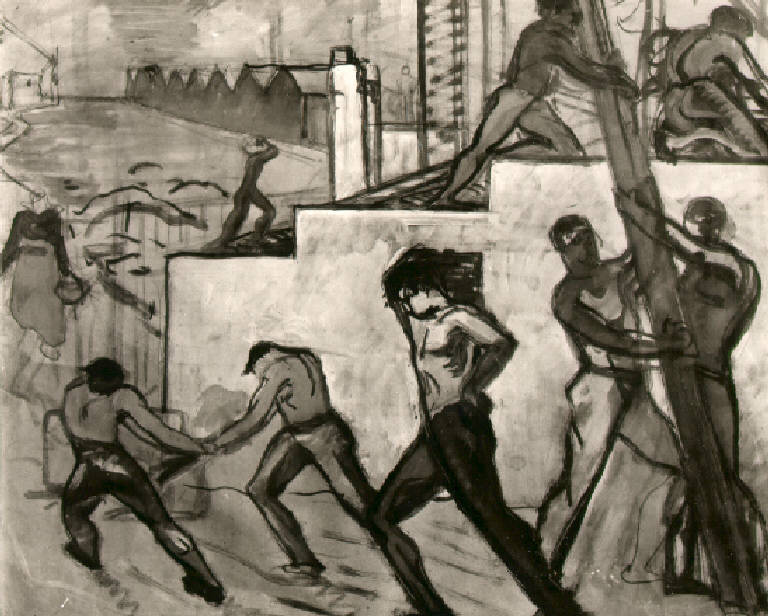In primo piano a destra due operai alzano un palo, al centro un muratore a torso nudo porta sulla spalla destra un carico, a sinistra due figure di spalle spingono un blocco. In secondo piano a destra, su una larga gradinata, sono un altro manovale con peso sulle spalle, operaio in ginocchio che aiuta a sollevare il palo ed altra figura accosciata vista di schiena; a sinistra cammina donna con lunga gonna e cesto nella sinistra. Sullo sfondo a sinistra spiazzo con serie di capannoni in prospettiva.
