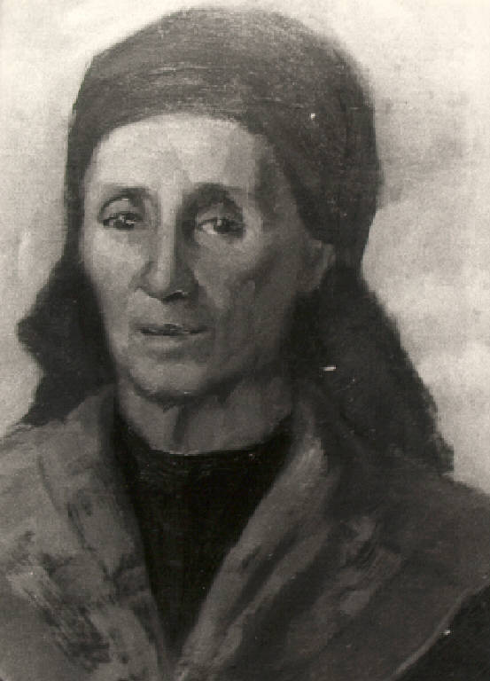 Donna vecchia a mezzo busto frontale con fazzoletto in testa.