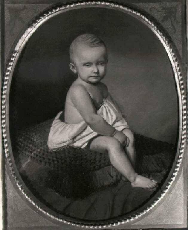 Al centro del Adelina Pozzi bambina seduta verso destra su un cuscino indossa un camicino.