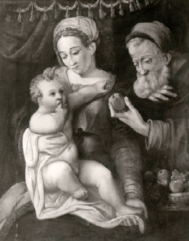 Seduta sotto un baldacchino la Madonna tiene in grembo Gesù Bambino, al quale San Giuseppe, a destra, porge una mela.