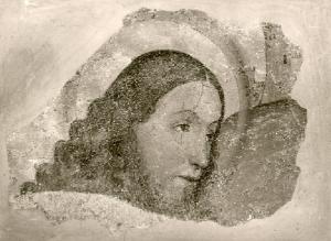 In primo piano è il volto di Gesù Cristo leggermente di tre quarti verso destra con aureola. Sullo sfondo paesaggio con veduta di un castello.
