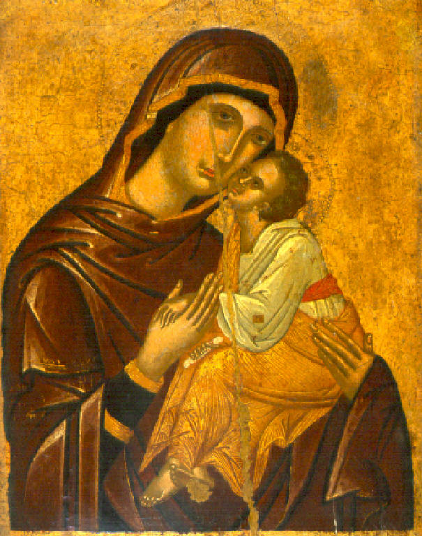 La Madonna, a mezza figura, tiene fra le braccia Gesù Bambino; fondo d'oro.
