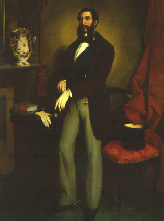 Un giovane uomo,con folti favoriti, è in piedi accanto alla mensola di un caminetto e si sta sfilando un guanto; sul tavolino alla sua destra sono posati un bastone da passeggio, un libro ed un altro guanto; sulla sedia alla sua sinistra un cappello.