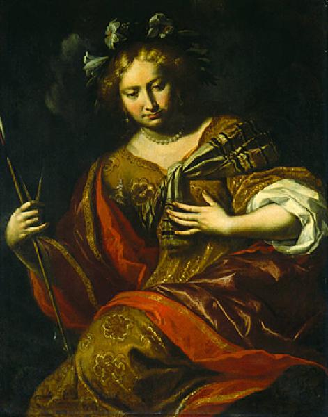 Figura di donna seduta, lo sguardo rivolto verso il basso, tiene la mano sinistra al petto, reggendo nella destra un compasso e una freccia; indossa ricche vesti di broccato, ha sul capo una ghirlanda di fiori e al collo un giro di perle.