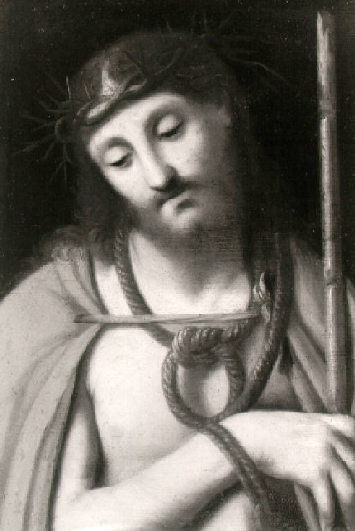 Gesù Cristo a mezzo busto con corona di spine, canna nella mano destra, mantello allacciato sul petto, polsi legati al collo con una grossa corda, nell'atteggiamento dell'Ecce Homo.