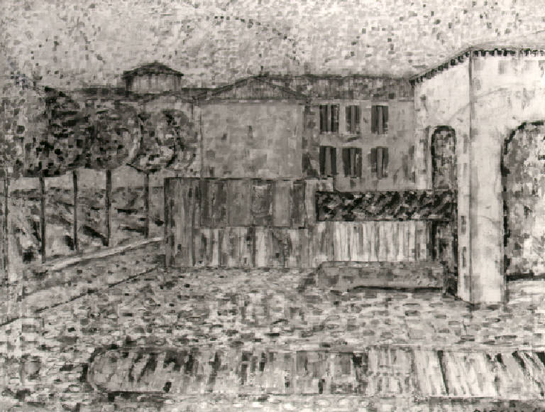 Piazza coperta di ciottoli limitata a sinistra da un filare di alberi e sul fondo da case con finestre; a destra inizia una strada fiancheggiata da un edificio con portico. In secondo piano a sinistra, oltre le piante, chiesa con tiburio.