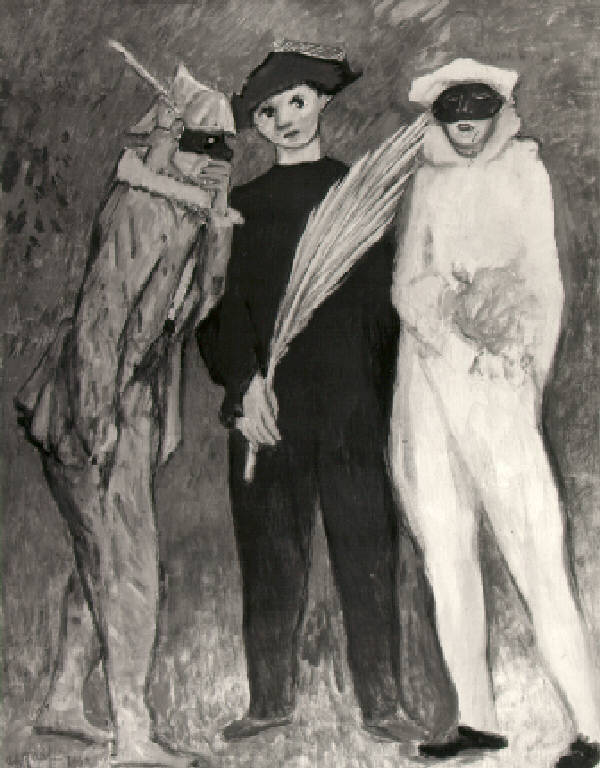 A sinistra, Arlecchino che avanza di profilo con una mano nella tasca dei pantaloni e l'altra alla bocca; al centro, di fronte, ragazzo indossa costume scuro e tricorno e tiene nella destra la foglia di palma; a destra altra figura con costume e cappuccio bianco ha gli occhi e il naso coperti da una maschera.