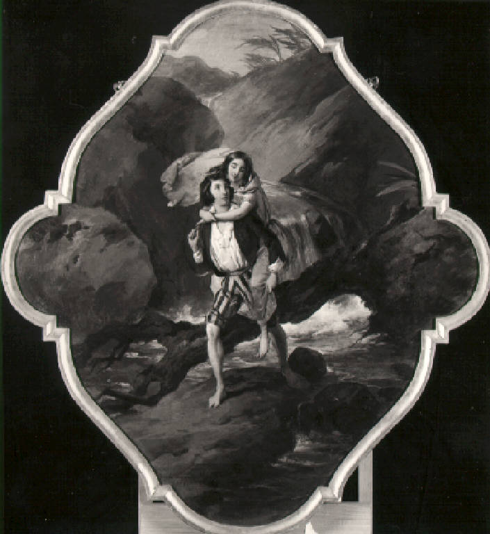 Paolo con i calzoni rimboccati sopra il ginocchio guada un fiume vorticoso portando sulle spalle Virginia, dietro loro un albero sradicato giace di traverso.