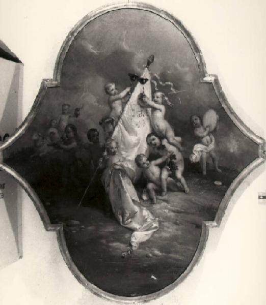 Un gruppo di putti danza intorno ad una bandiera con monogramma entro corona vegetale; due di essi sollevano delle coppe, altri grappoli d'uva e strumenti musicali, sullo sfondo un agnello.