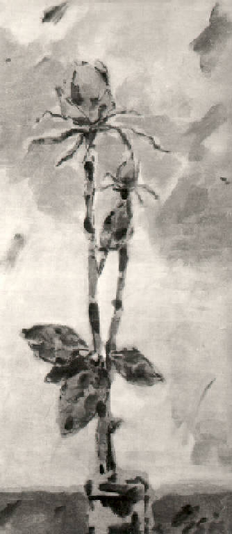 Dalla bocca circolare di un vaso spuntano due alti steli con poche foglie nella parte inferiore e che terminano ognuno in una rosa in bocciolo.