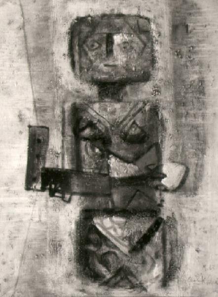Personaggio a mezza figura ottenuto con forme cilindriche, dipinte per suggerire le partizioni anatomiche del corpo, tiene fra le mani un oggetto.\n.