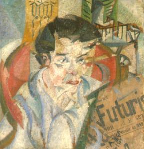 Ritratto a mezzo busto della madre del pittore Achille Lega, frontale, il viso volto a destra; sulla destra del dipinto compare un frammento di un giornale del 1917.