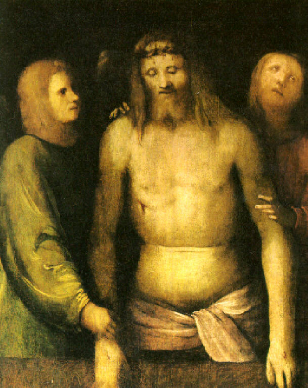 Sul fondo scuro spiccano, per tre quarti dell'altezza, Gesù Cristo morto, al centro e di fronte, con perizoma e corona di spine in testa, e due angeli laterali, visti leggermente di scorcio ed in atteggiamento doloroso, che lo sostengono per le braccia e le spalle. Le tre figure emergono dal bordo di marmo del sarcofago, che si allunga per l'intera larghezza del dipinto.