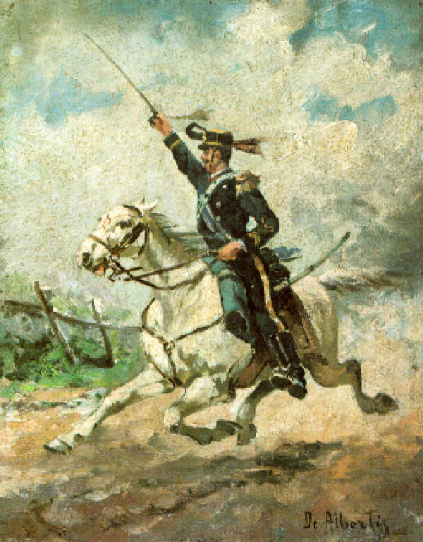 Ufficiale di cavalleria al galoppo con spada sguainata. Sullo sfondo, steccato e cielo nuvoloso.