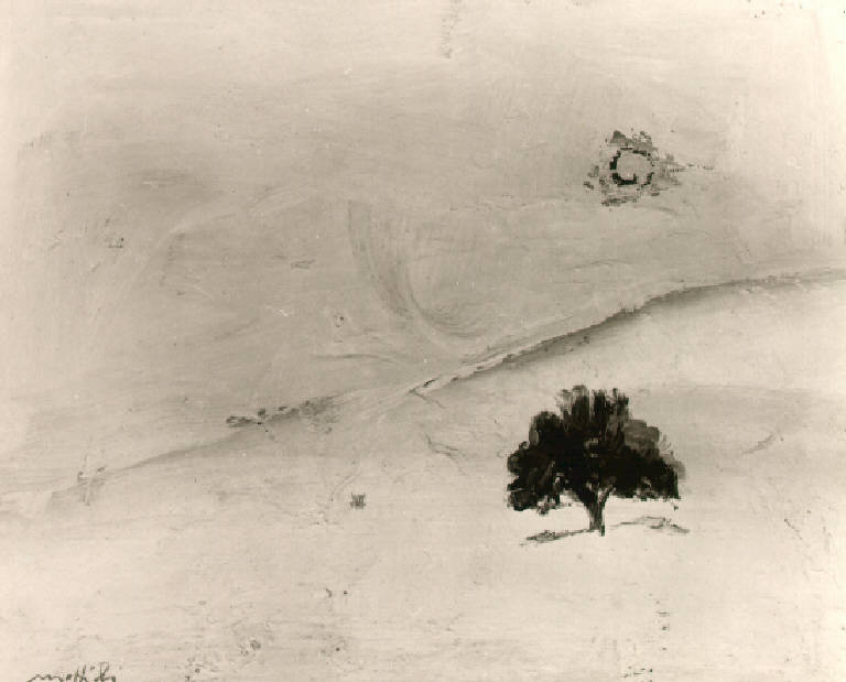 Albero a destra in basso, su assolato pendio segnato in diagonale; in alto a destra sole.