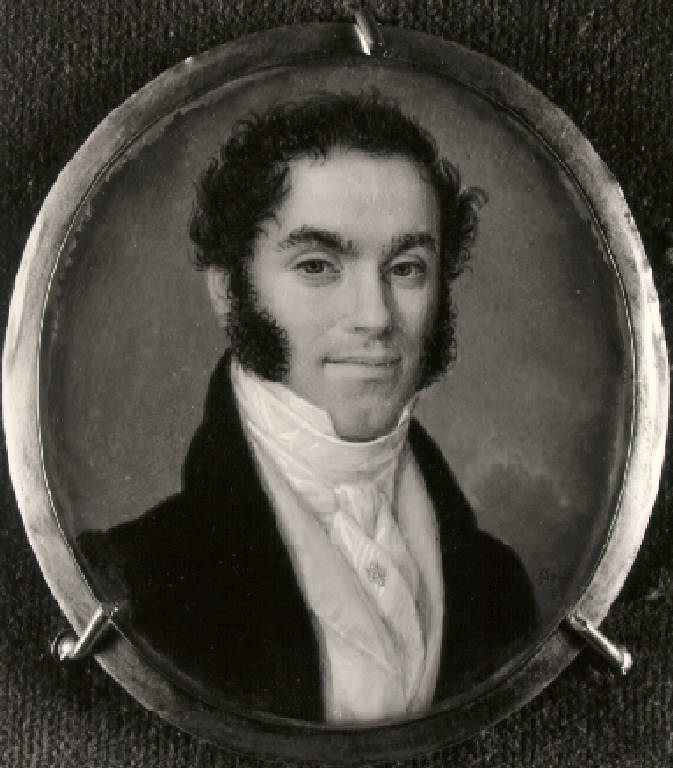 Un giovane uomo a mezzo busto con folti favoriti, indossa una sciarpa fermata da una spilla a forma di mosca.