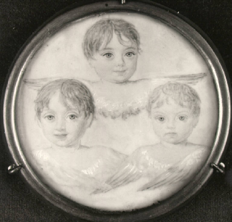 Tre volti di bambini disposti a piramide, il busto termina con ali.