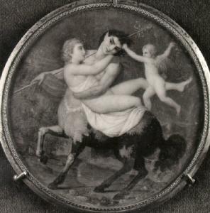 Un centauro, in corsa verso sinistra, tiene tra le braccia una ninfa che gli resiste mentre un amorino gli tira i capelli.