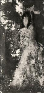 Figura femminile in piedi, volta leggermente verso sinistra; ha i capelli neri ed il volto non ha il disegno dei lineamenti.