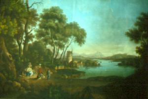 Sulla riva di un corso d'acqua, un gruppo di figure, tra cui una femminile seduta, davanti alla quale viene portato un cesto (?); sullo sfondo, una torre, edifici e un ponte ad arcate.