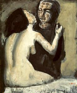 Una donna ignuda, seduta di tre quarti verso destra, tiene per le spalle un'altra figura in piedi di fronte a lei.