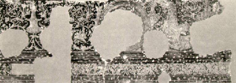 Al centro tondo entro cui doveva essere un ritratto; ai lati grottesche e volute vegetali.