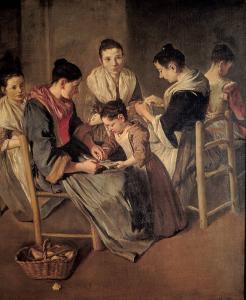 In un interno cinque giovani donne siedono in varie pose su delle seggiole e lavorano; presso la figura in primo piano è una bambina che sta imparando a leggere sul libro posato sulle gambe del personaggio seduto; in basso a sinistra cestino di vimini.