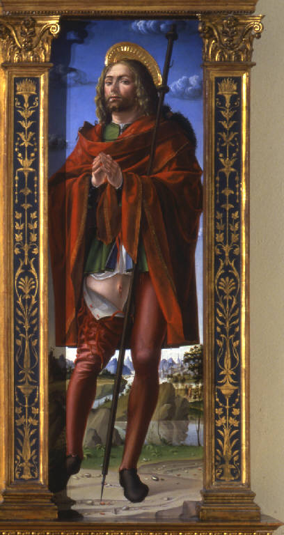 San Rocco a figura intera, volto leggermente verso sinistra, tiene le mani giunte in atteggiamento orante, sorreggendo il bordone. Alle sue spalle paesaggio roccioso in cui si snoda un fiume; in lontananza, a destra, si scorge una città.