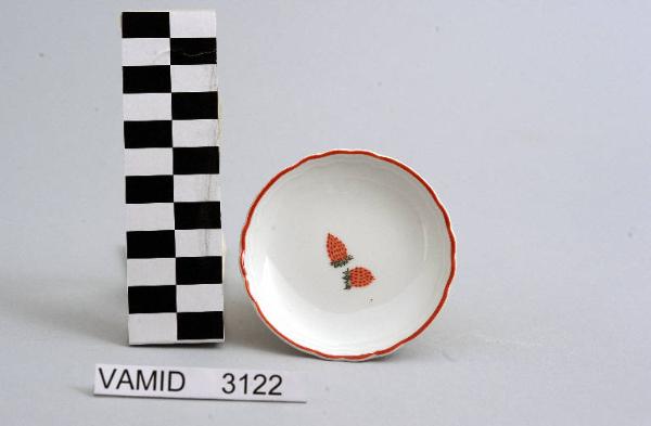 Ciotola con orlo crestato; fondo bianco uniforme con fragole al centro; bordo rifinito con filettatura rossa.