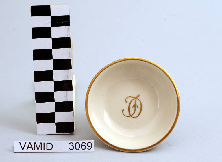 Ciotola circolare; fondo bianco avorio con bordo rifinito con filettatura oro.