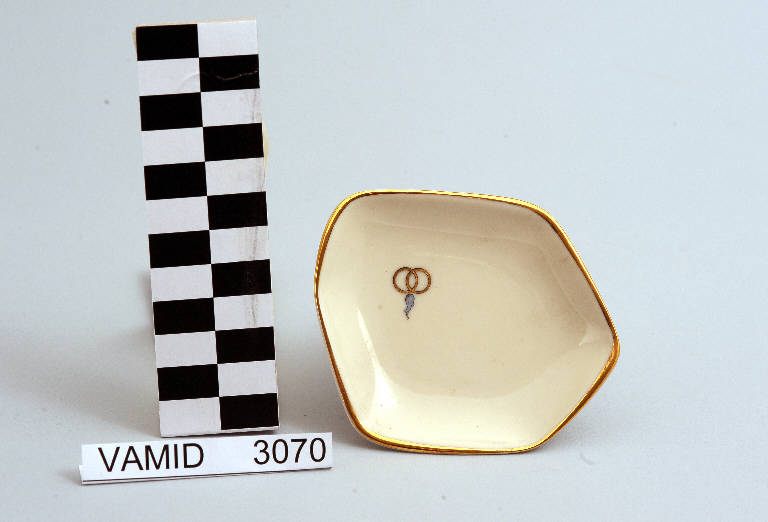 Posacenere dalla forma irregolare; fondo bianco decorato con fedi matrimoniali intrecciate.