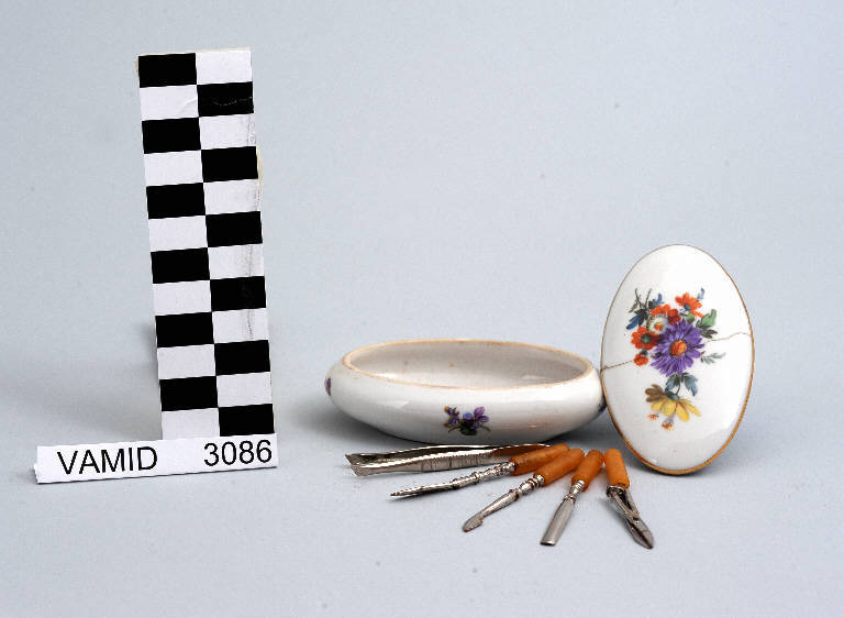 Bomboniera di forma ovale con coperchio; fondo bianco con bouquet floreale policromo all'esterno e sul coperchio; bordo rifinito con filettatura oro.
