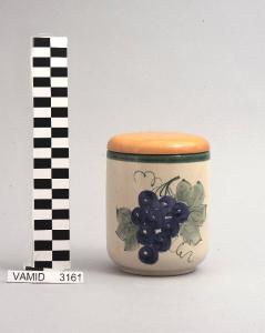 Barattolo cilindrico bianco decorato all'esterno con grappolo d'uva; coperchio liscio in legno; bordo rifinito in verde.