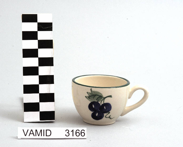 Tazzina da caffè con corpo leggermente svasato; manico a "C" schiacciato; fondo bianco decorato con grappolo d'uva; bordo rifinito in verde.