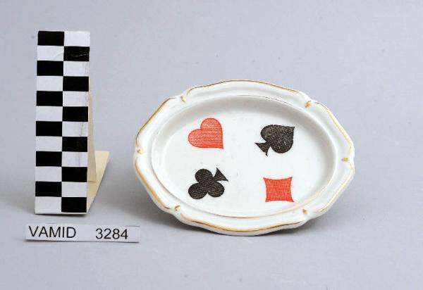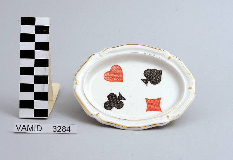 Posacenere con orlo leggermente ondulato; fondo bianco con simboli delle carte da gioco (quadri, picche, cuori e fiori), in nero e rosso; bordo rifinito con filettatura oro.