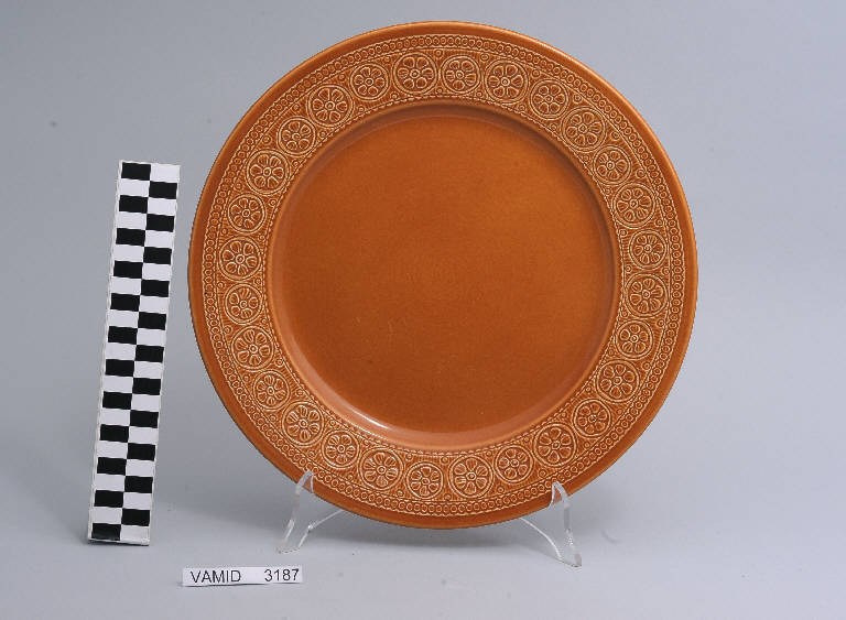 Piatto piano circolare fondo color terracotta; motivi decorativi geometrici e vegetali a rilievo lungo la tesa.