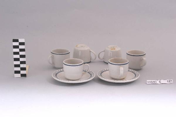 Servizio da caffè composto da due piattini decorati con motivi geometrici stilizzati in blu e sei tazzine con bordo superiore profilato di blu.