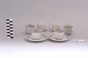 - NOTIZIE STORICO CRITICHE La foggia del servizio in esame e la tipologia del decoro dei due piattini (nn. inv. 3688-3689) indicano una piena assimilazione della lezione del funzionalismo e quindi una datazione ormai oltre la metà del Novecento confermata anche dal marchio presente sul fondo usato dalla Richard Ginori dal 1950 al 1990 circa su tutti gli oggetti prodotti nello stabilimento di Lambrate. Il servizio, composto da otto elementi, fa parte di una donazione di privati al Museo.