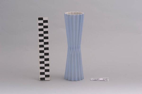 Vaso dalla forma irregolare con piegature e leggero restringimento al centro; fondo di colore azzurro; bianco internamente.