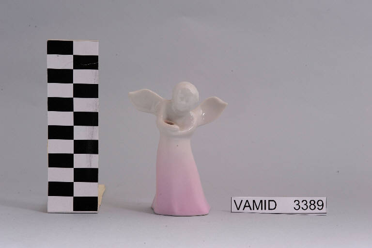 Candeliere a forma di angelo con ali spiegate; fondo di colore bianco sfumato nei toni del rosa.