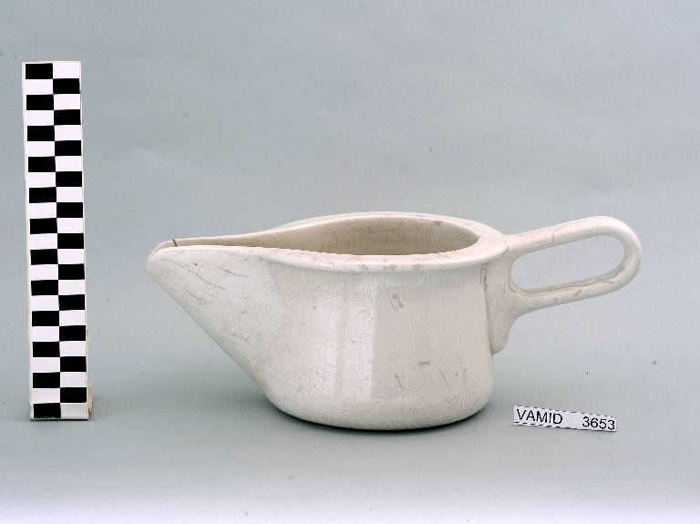 - NOTIZIE STORICO CRITICHE Il manufatto in esame rientra in una tipologia di vasellame di gusto corrente. Il design funzionale, caratterizzato da un beccuccio sporgente e da un manico ellittico facilmente impugnabile, denota una ricerca stilistica riferibile ad una produzione forse circoscrivibile al secondo quarto del Novecento. La mancanza di motivi ornamentali impedisce una definizione cronologica più circoscritta. Il pitale fa parte di una donazione di privati al Museo.