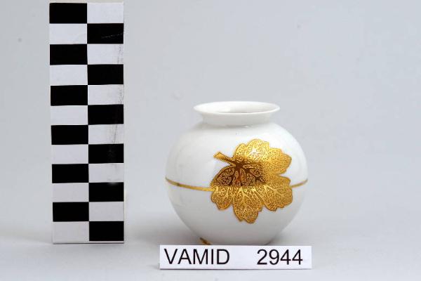 Vasetto con piede circolare e corpo panciuto; imboccatura leggermente estroflessa; fondo bianco decorato da una foglia di vite dorata.