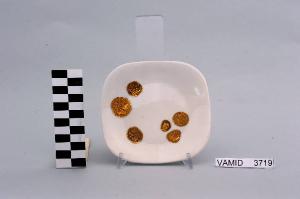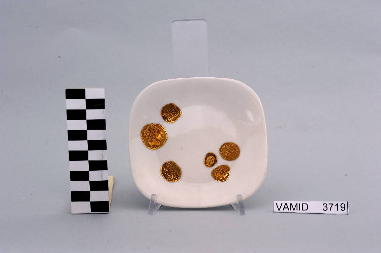 Posacenere di forma quadrata con angoli arrotondati; fondo bianco decorato da monete dorate in posizione decentrata recanti teste.