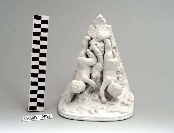 Mensola con corpo allungato; piano rettangolare con angoli arrotondati; fondo bianco con putti e tralci vitinei a rilievo.